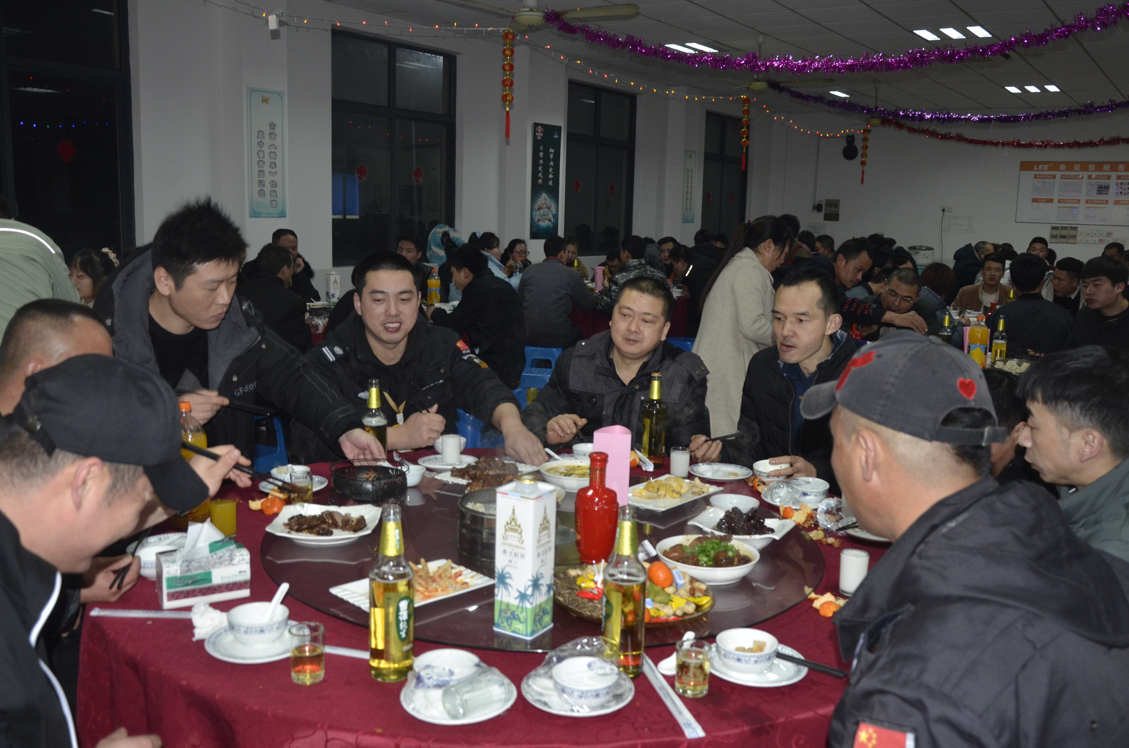 宏利公司聘請(qǐng)大廚,在廠區(qū)準(zhǔn)備年夜飯,留平員工一邊吃著熱乎乎的年夜飯,一邊載歌載舞,歡慶新年;